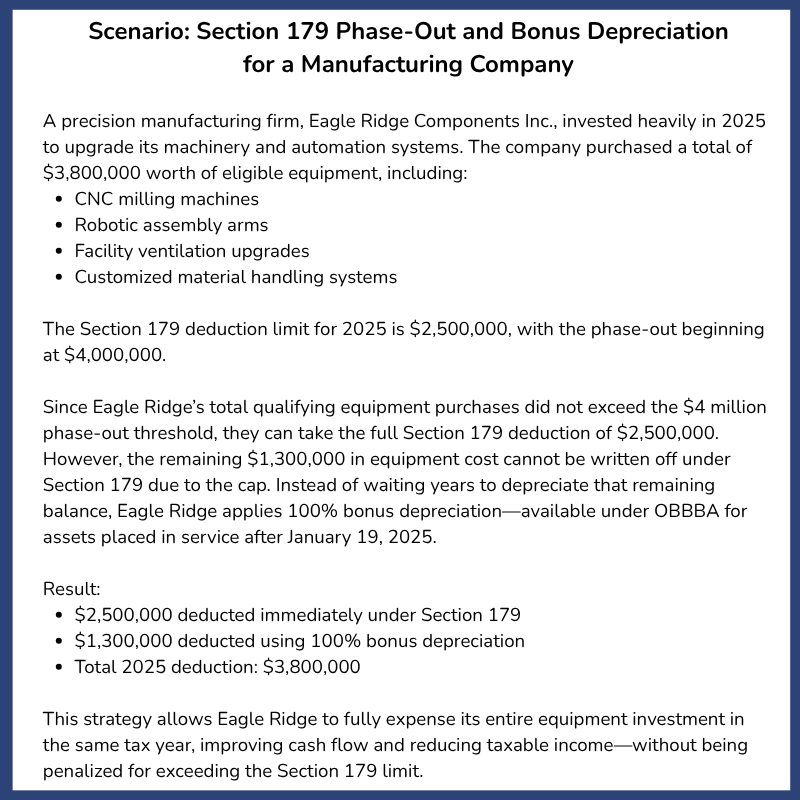 Alongside bonus depreciation, OBBBA also raises the Section 179 expensing limit to $2.5 million in 2025 and $4 million in 2026. This creates powerful planning flexibility:
