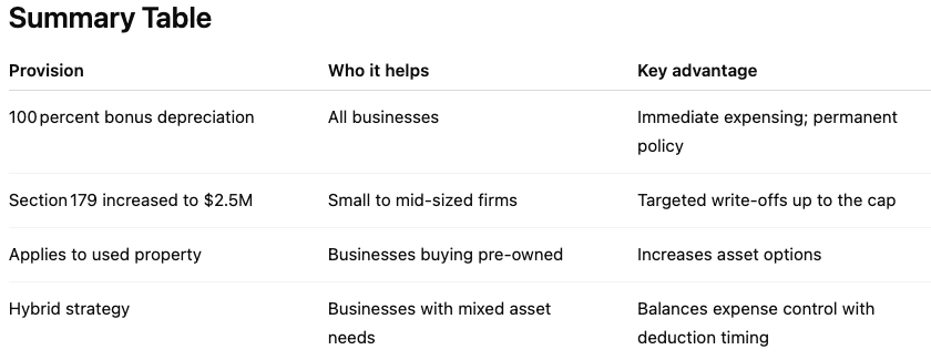 Together, these provisions allow clients to front-load deductions, manage taxable income effectively, and preserve operating cash flow.